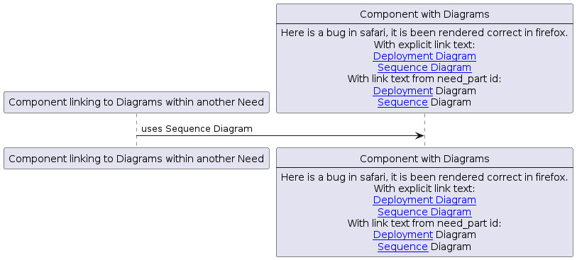 @startuml participant "Component linking to Diagrams within another Need" as C_LINK2DIAGRAMS [[../architecture-examples.html#C_LINK2DIAGRAMS]] participant C_DIAGRAMS [[../architecture-examples.html#C_DIAGRAMS]] [ Component with Diagrams ---- Here is a bug in safari, it is been rendered correct in firefox. With explicit link text: [[../architecture-examples.html#C_DIAGRAMS.Deployment Deployment Diagram]] [[../architecture-examples.html#C_DIAGRAMS.Sequence Sequence Diagram]] With link text from need_part id: [[../architecture-examples.html#C_DIAGRAMS.Deployment Deployment]] Diagram [[../architecture-examples.html#C_DIAGRAMS.Sequence Sequence]] Diagram ] C_LINK2DIAGRAMS -> C_DIAGRAMS : uses Sequence Diagram @enduml Following needarch is been added with needs template Deployment Diagram
