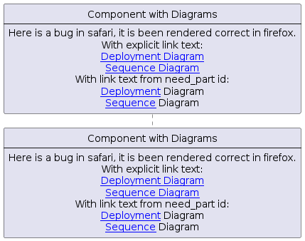 @startuml participant C_DIAGRAMS [[../architecture-examples.html#C_DIAGRAMS]] [ Component with Diagrams ---- Here is a bug in safari, it is been rendered correct in firefox. With explicit link text: [[../architecture-examples.html#C_DIAGRAMS.Deployment Deployment Diagram]] [[../architecture-examples.html#C_DIAGRAMS.Sequence Sequence Diagram]] With link text from need_part id: [[../architecture-examples.html#C_DIAGRAMS.Deployment Deployment]] Diagram [[../architecture-examples.html#C_DIAGRAMS.Sequence Sequence]] Diagram ] @enduml Following needarch is been added with needs template Deployment Diagram